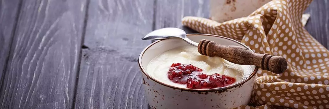 Masę przelej do płaskiego naczynia , ostudź i wsadź do lodówki. Po 2 godzinach wyjmij z lodówki i pokrój w prostokąty. Deser podawaj z konfiturą malinową lub truskawkową.