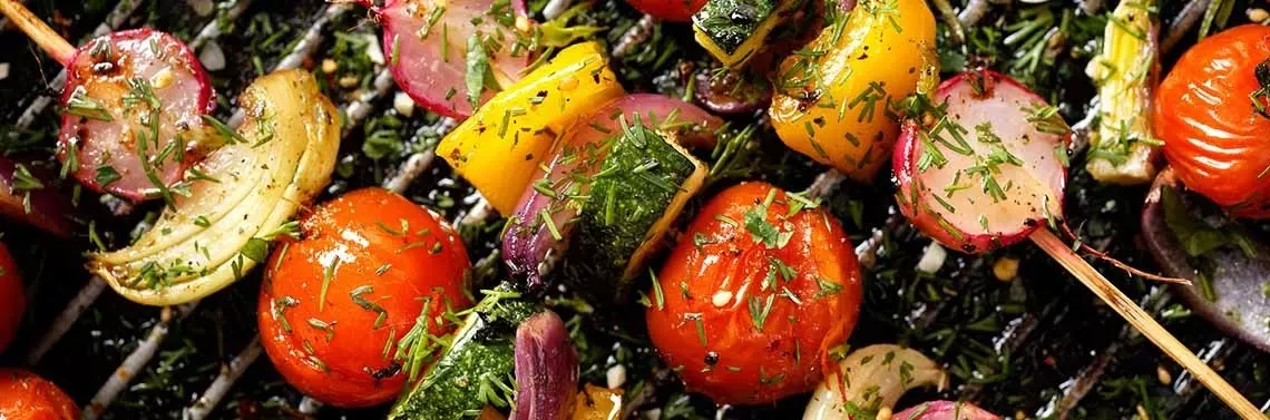Na ruszt wrzucaj to, co jest obecnie dostępne w warzywniaku. Właśnie rozpoczął się sezon na cukinię. Możesz podać ją z grillowanym serem (mozzarellą, halloumi lub camembertem) – to idealny dodatek do mięsa, jednak sprawdza się także jako samodzielne danie. Spróbuj również kabaczków w marynacie z oliwy i czosnku. Im w drobniejsze plastry je pokroisz, tym bardziej będą chrupiące. Wegetarianom do gustu przypadną szaszłyki z tofu, warzyw i… owoców, np. ananasa czy winogron. Na stole nie może zabraknąć sałatki ze świeżych warzyw. Uniwersalna propozycja to plastry pomidora w dressingu z oliwy, miodu i soku z cytryny, w towarzystwie cebuli pokrojonej w piórka i świeżych listków bazylii.